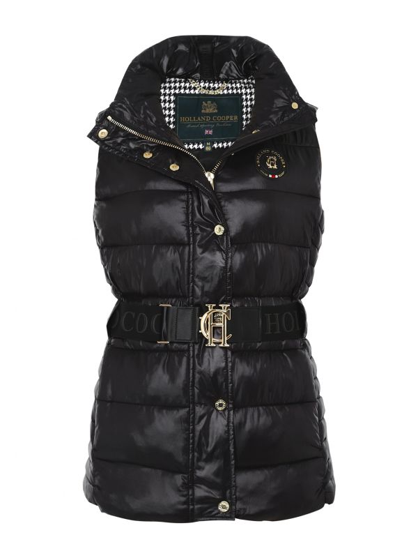 Get a luxe transitional look with the Holland Cooper Valais gilet. This lustrous quilted gilet has a soft velour touch and is cut for a flattering silhouette, with an integrated waist belt complete with branded details and an iconic HC buckle. The gilet boasts a premium eco fill and is complete with a zip and snap button fastening, oversized face-framing collar, two zippered pockets, stunning silicone print and gold-tone hardware.
