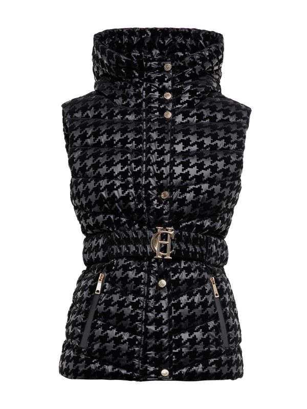 Layer up in the Holland Cooper Vermont quilted gilet and keep your torso cosy. This sleeveless gilet has a padded body and high collar with a hood. It has a mono houndstooth pattern throughout and is complete with an integrated HC belt with buckle and gold hardware. Layer it over knitwear to stay extra warm.