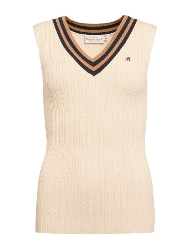 The Zoe Sleeveless Tank by Holland Cooper is constructed from a sumptuous blend and features a cable-knit through the body and contrast rib stripes at the V-neckline. Designed with a slim fit and finished with HC embroidery on the chest, this Holland Cooper tank is the perfect piece to wear solo or layered over a shirt.