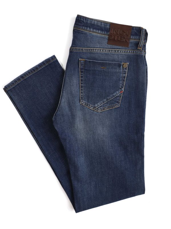 The Incotex Five-Pocket Jeans feature traditional five-pocket tailoring with branded metal rivets and a leather waistband patch. Subtle faded wash and tonal stitching add quiet character, while a small elastodiene content provides gentle stretch for comfort. Finished with a coin pocket and reinforced rivets, these jeans focus on practical construction and dependable wear. Clean detailing makes them an understated option for everyday casual outfits.