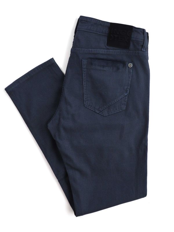The Incotex Micro Houndstooth Pants present a refined five-pocket silhouette detailed in a textured micro houndstooth weave. Cut with a neat leg and classic waistband, they feature contrast rivet hardware and a tonal leather logo patch at the rear. A versatile option that pairs with knitwear or tailored shirts, the piece balances casual structure with subtle patterning.
