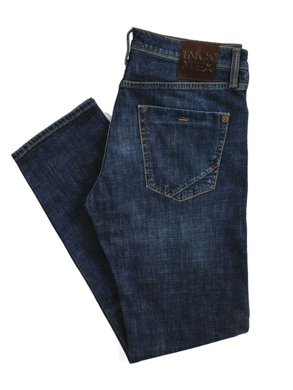 The Incotex Slim Denim Jeans offer a modern slim silhouette with practical five-pocket construction, a coin pocket and metal rivets for durable reinforcement. A waistband patch bears the brand's embossing, while contrast topstitching and subtle whiskering add texture. Belt loops provide easy styling options and the cut pairs well with Sneakers or boots. The denim has a softly aged finish and tonal hardware that complements both tailored and casual layers.