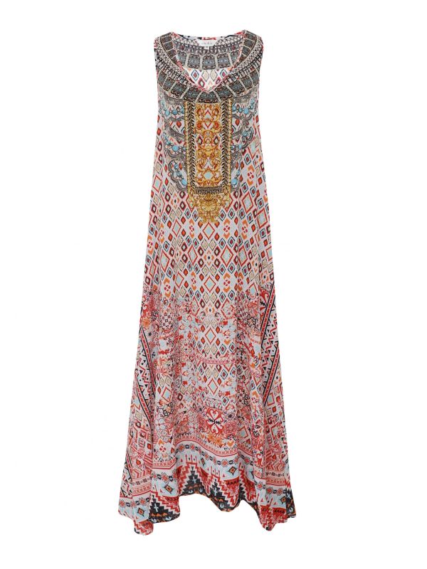 Add a dose of statement style to your summer wardrobe with the Inoa Aleppo maxi dress. Expertly handcrafted in silk with embellished crystal details to the front, this stunning dress is a must-have for your next holiday. The dress boasts a sleeveless design and features a flattering v-neck and laid-back silhouette, while its vibrant 'Aleppo' print provides a statement finishing touch.