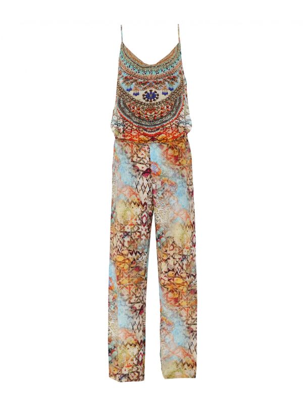 The Inoa Arizona jumpsuit is a sophisticated wardrobe staple, perfect for dressing up or down this summer. Handcrafted in silk and embellished with sequins and jewels for an elegant look, this beautiful jumpsuit can be worn with sandals on laid-back days or teamed with heels and a clutch for a more glamorous ensemble. The jumpsuit features a V-neck, adjustable spaghetti straps, elasticated waist and self-tie waist belt, with the label's SS20 'Arizona' print throughout for a statement finish.