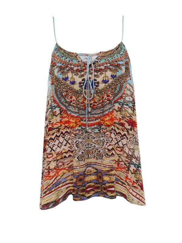 Add a dose of statement style to your everyday wardrobe with the Inoa Arizona shoe string cami. This laid-back top is cut from silk and is perfect for styling with denim shorts and sandals. It features spaghetti straps, a drawstring neckline with tie front detail and crystal embellishment to the front, with an all-over bohemian 'Arizona' print.