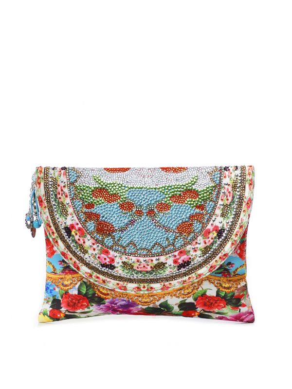 Complete your summer ensembles in style with the Inoa Covent Garden clutch bag. This beautiful canvas clutch has a front flap with magnetic clasp as well as a secure zip fastening. The front is adorned with crystal embellishment for a luxurious look, while an all-over floral 'Covent Garden' print ensures a vibrant finish. The bag is complete with an interior zip pocket and detachable charm detail.