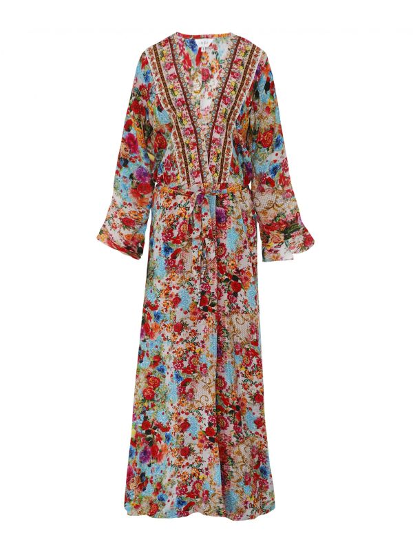 The Inoa Covent Garden luxe robe is the ultimate piece of resortwear to take you from beach to bar. Cut from silk, this elegant robe features a V-neck complete with embellished details, self-tie waist belt, long frill sleeves and inseam side pockets. This beautiful vacation piece can easily be layered over your favourite swimwear and teamed with your favourite sandals for a stylish summer look.