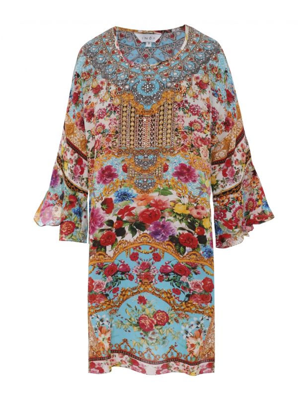Elevate your wardrobe this season with the Inoa Covent Garden short kaftan. Beautifully crafted in silk and embellished with crystal details to the front, this elegant kaftan is the ultimate piece for laid-back summer days. This chic mini dress features a classic round neckline and long frill sleeves, while its floral 'Covent Garden' print provides a statement finish.