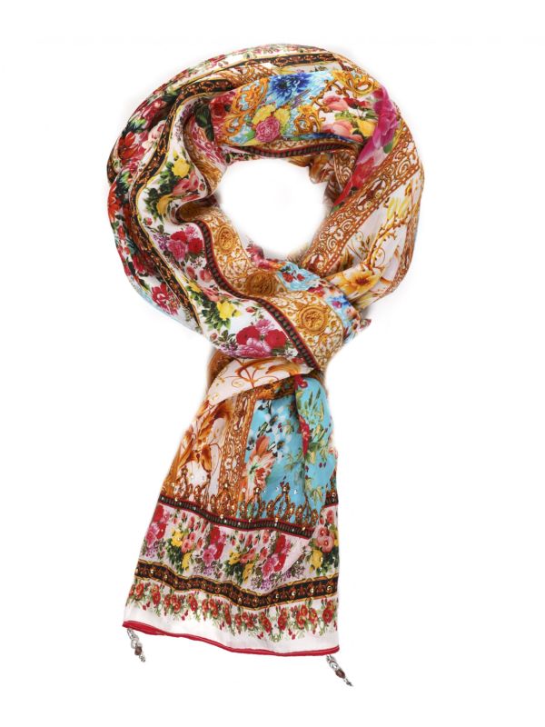 This Inoa Covent Garden scarf is a statement accessory for summer styling, crafted in luxurious silk and adorned with a vibrant floral print. The scarf is complete with gemstone detailing and a silver-tone charm detail at each corner for a stylish finish and is the perfect piece to elevate your everyday outfits.