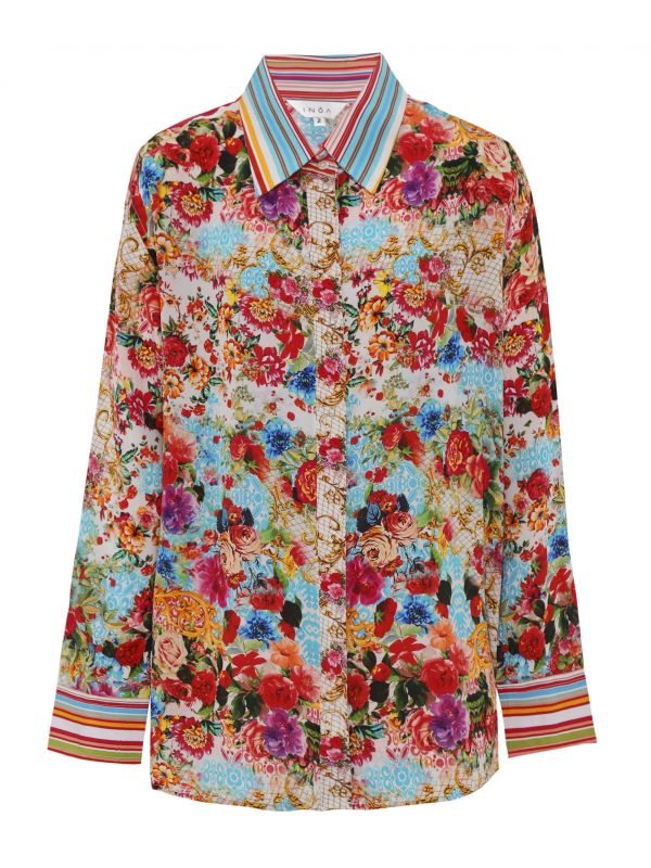 Get a chic statement look this season with the Inoa Covent Garden shirt. Crafted in silk, this luxurious shirt is adorned with the brand's beautifully vibrant Covent Garden print, with colourful florals and gilded patterns throughout. The shirt has a button down fastening, concealed placket and long sleeves, with a contrast trim at the collar and cuffs.