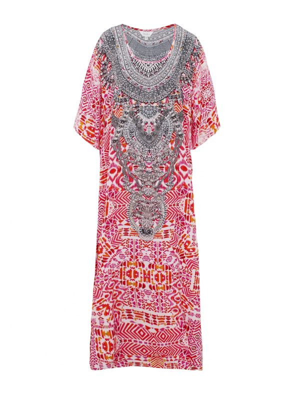 The Inoa Shiraz long kaftan is bold and beautiful, offering a statement look for your summer wardrobe. Skilfully crafted in 100% silk and hand-embellished with crystal detailing to the front, this luxurious kaftan features the brand's latest 'Shiraz' print, incorporating a range of geometric shapes. The kaftan is complete with a classic round neckline and draped sleeves.