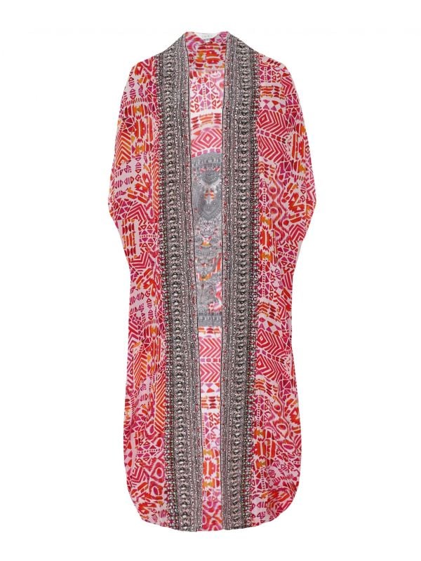 The Inoa Shiraz shrug will add a touch of glamour to your everyday wardrobe. This lightweight jacket is crafted from 100% silk and features an open front and draped sleeves, while its vibrant 'Shiraz' print, contrast trim detail and crystal embellishment provide an elegant finish. Wear with a basic tee and your favourite jeans this season.