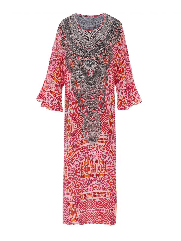 Get a glamorous look this summer with the Inoa Shiraz frill sleeve kaftan. Expertly handcrafted in silk, this luxurious maxi dress is perfect for beach holidays and laid-back summer days. It features a classic round neckline, casual draped silhouette and long frill sleeves, while its statement 'Shiraz' print provides a vibrant finish.
