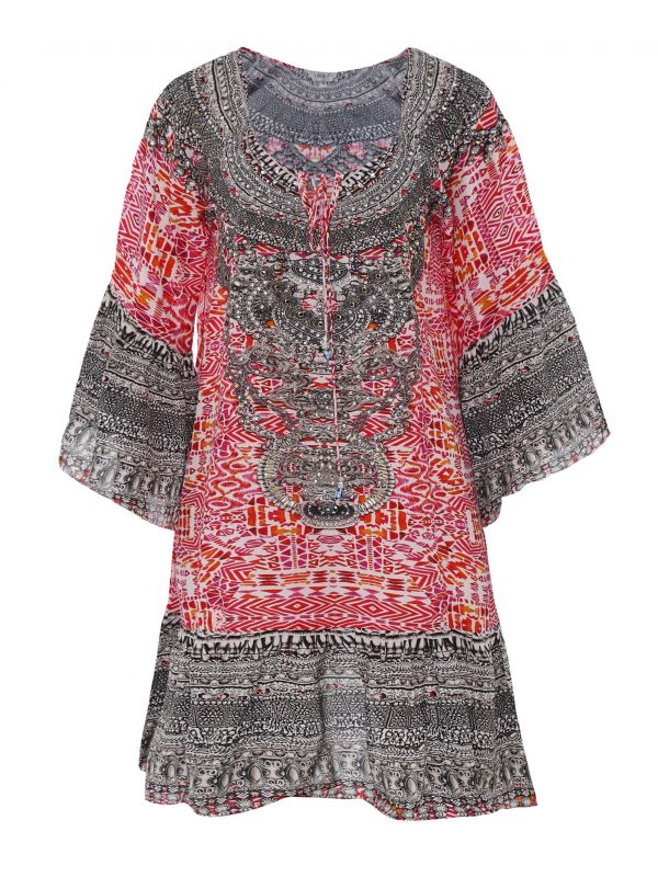 The Inoa Shiraz gypsy dress boasts an on-trend bohemian look and will make an elegant addition to your casual wardrobe. This floaty mini dress is made from 100% silk and features a drawstring neck, retro bell sleeves and glamorous embellished crystal details. Wear with your favourite sandals or sneakers for an effortless everyday look.