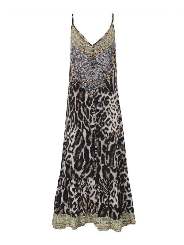 Add a dose of statement style to your new-season wardrobe with the Inoa Siberia maxi dress. Handcrafted in silk and embellished with crystals for touch of glamour, this beautiful button down dress is sure to elevate your holiday looks. It features adjustable shoulder straps, fabric covered buttons and a unique frill hem, while its all-over 'Siberia' print completes the on-trend aesthetic.