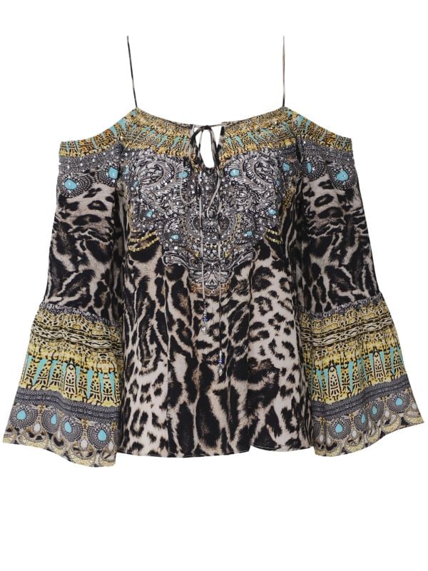 The Inoa Siberia gypsy top is the perfect piece for summer festivals and holidays, handcrafted in silk and embellished with crystals for a luxe boho look. Featuring the label's 'Siberia' print for a dose of bold style, this flowing top features a drawstring neckline, cold shoulder design, voluminous bell sleeves and beautiful beaded detailing. Wear yours with denim shorts and sandals for a chic summer look.