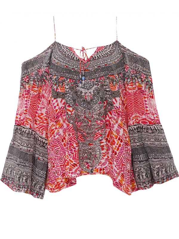 The Inoa gypsy top is the perfect piece for summer festivals and holidays, handcrafted in silk and embellished with crystals for a luxe boho look. Featuring the label's 'Arizona' and 'Shiraz' prints for a vibrant look, this flowing top features a drawstring neckline, cold shoulder design, voluminous bell sleeves and beautiful beaded detailing. Wear yours with denim shorts and sandals for a chic summer outfit.