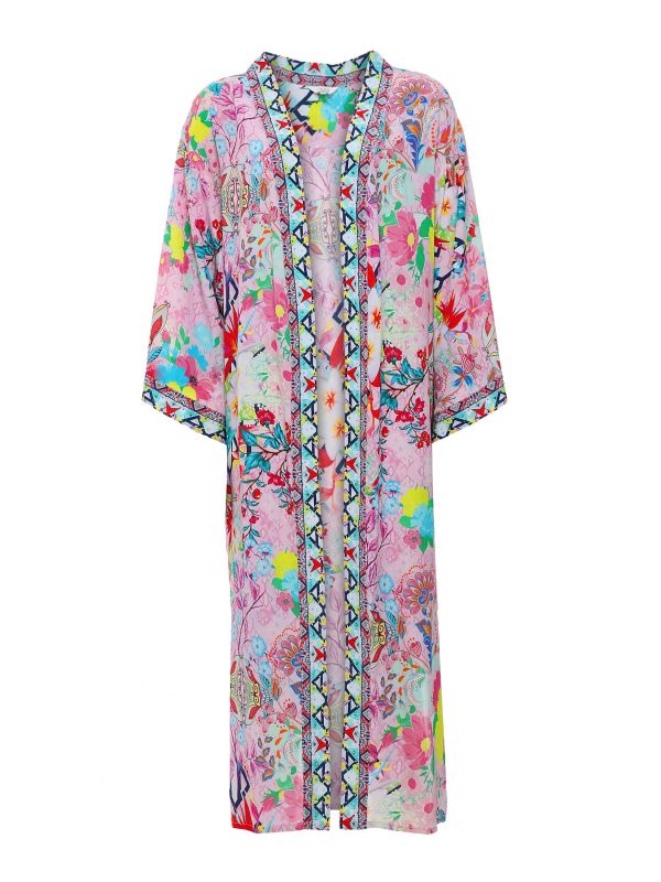 The Inoa kimono is the perfect piece to effortlessly throw over your Spring/Summer outfits. Crafted from pure silk, the beautiful lightweight kimono offers delicate jewels embellished throughout. With 3/4 sleeves and a floral print, the Inoa kimono will be sure to make you standout this season.