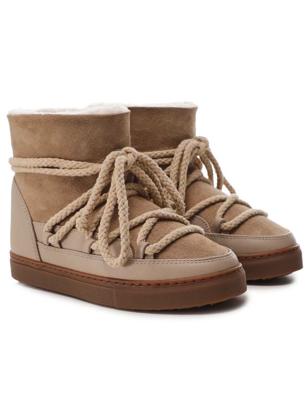 The Classic Boots from INUIKII rework traditional winter footwear with braided rope laces that wrap the ankle and a plush interior for comfortable warmth. A suede upper sits alongside leather trims and a reinforced heel counter stamped with tonal branding, while a textured rubber sole provides dependable grip. The ankle-height silhouette pairs easily with denim or skirts for casual winter styling. Visible stitching around the sole adds a crafted finish and the generous lacing allows an adjustable fit. Ideal for everyday wear.