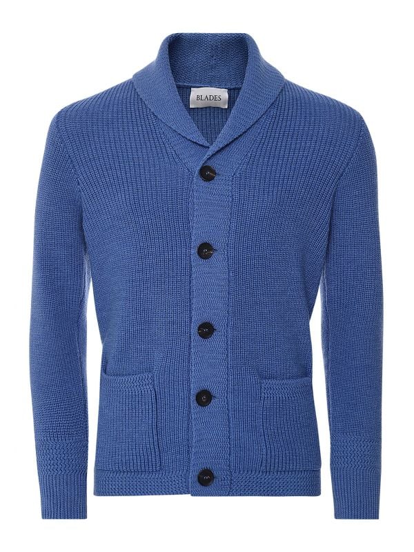 Elevate your knitwear with the J. Blades shawl cardigan. Lovingly crafted in Scotland using the finest merino wool, the cardigan offers a soft, textured handle and ensures essential warmth. Featuring a handsome shawl collar, button through fastening and lower patch pockets, whilst the fresh blue hue makes for a charming aesthetic.