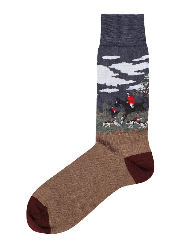 The J. Blades hunting dogs socks exude heritage-led character. Lovingly knitted in a warming wool blend, the socks will ensure cosy day-long comfort. Featuring traditional ribbed ankle cuffs, contrast panels and hand linked toes, whilst the jacquard hunt scene lends country gent style.