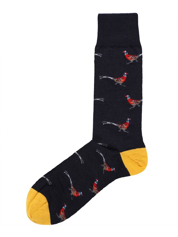 The J. Blades pheasant socks showcase quirky country gent appeal. Lovingly knitted in a warming wool blend, the socks will ensure cosy day-long comfort. Featuring traditional ribbed ankle cuffs, contrast panels and hand linked toes, whilst the jacquard pheasant pattern makes for a charming heritage-led aesthetic.