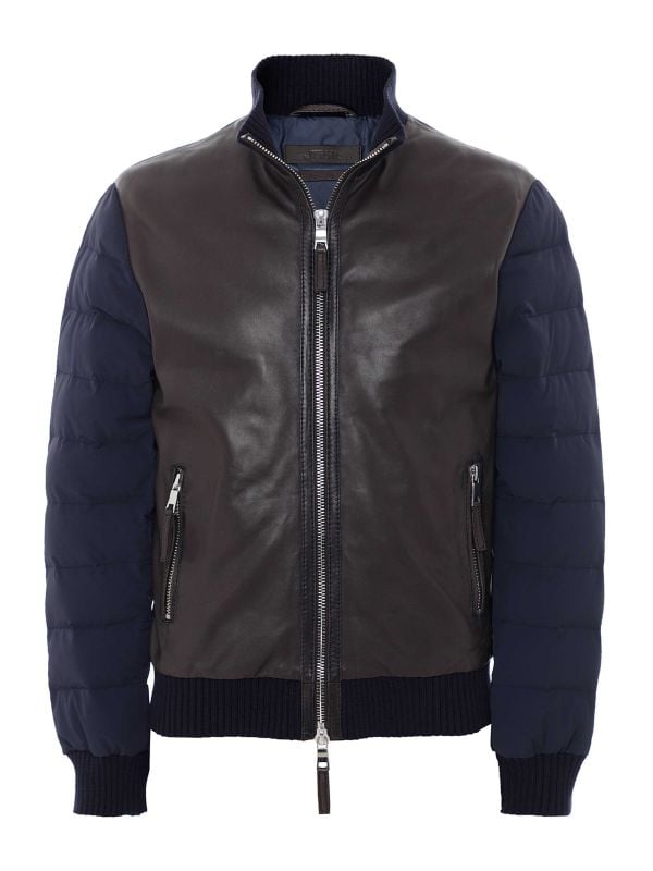 The David Leather Jacket by Jack Leathers updates the bomber silhouette with a smooth leather front and quilted sleeves for lightweight insulation. It has a ribbed stand collar, ribbed cuffs and hem, and a two-way zip fastening for versatile wear. Zip side pockets provide secure storage while metal hardware and tonal stitching add subtle detail. Tailored for a contemporary fit, this jacket layers cleanly over shirts or knits and offers structured warmth without excess bulk.