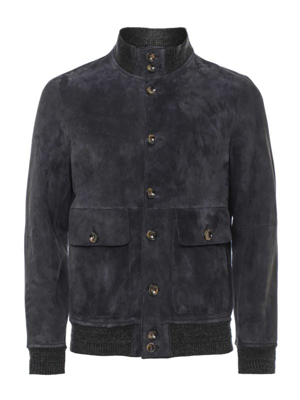 The Riverside Bonded Suede Jacket by Jack Leathers presents a pared-back bomber silhouette crafted in suede with knitted rib trims at the collar, cuffs and hem. It fastens with a button-front and features two buttoned flap pockets for practical storage. Tailored for a neat profile, it layers well over shirts or light knitwear. The textured suede surface adds depth while the ribbed trims ensure a comfortable fit. This jacket suits smart-casual wardrobes where quality materials meet considered detailing.