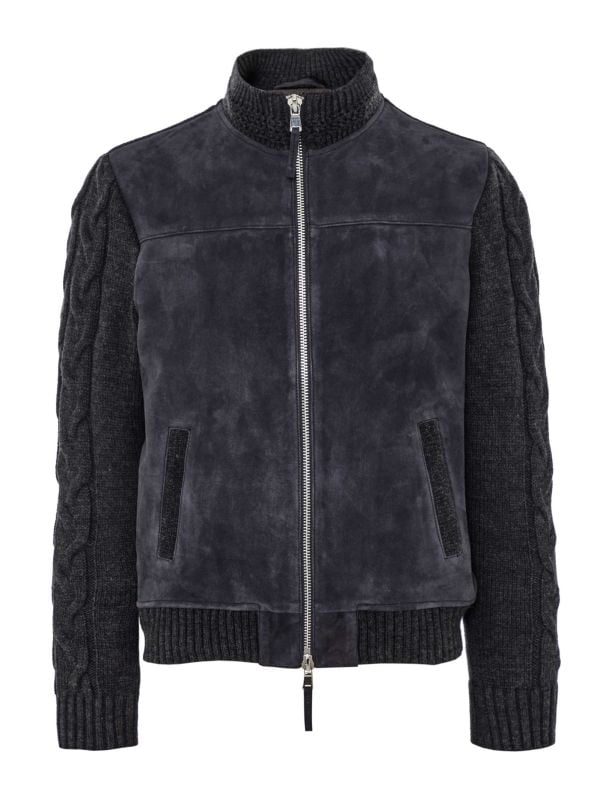 The Thames Knit Jacket by Jack Leathers is a zip-through jacket combining a suede front panel with cable-knit sleeves for a textural, layered effect. Designed with a ribbed stand collar, ribbed hem and cuffs, and a two-way metal zip, it features slanted welt pockets for discreet storage. The silhouette sits at the hip, offering a structured yet comfortable feel. The mix of suede and knit brings seasonal warmth while retaining a tailored look for smart-casual dressing. Ideal for layering under coats or over shirts.