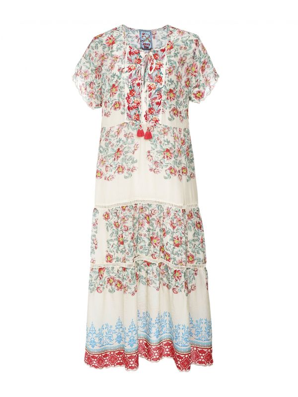Get a statement summer look with the Johnny Was Holly dress. Crafted in rayon, this lightweight midi dress is perfect for garden parties and days at the beach. It features a round neck with keyhole detail, tasselled neck ties, short sleeves, scalloped cuffs and hem and a tiered design with ladder-stitched inset details. Complete with a bold floral print and embroidered bodice, this unique dress is a must-have for your new-season wardrobe.