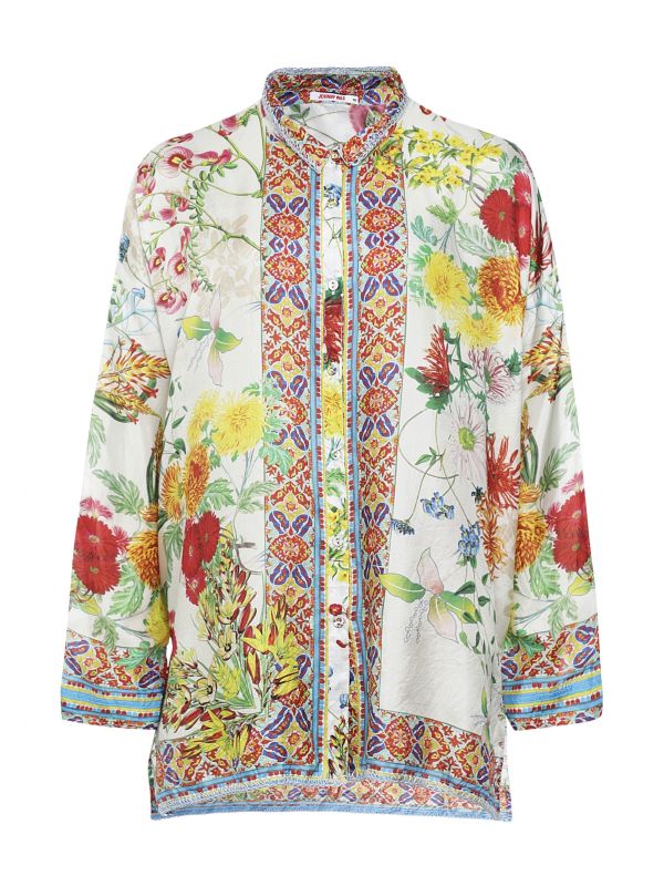 The Johnny Was Jaffa blouse is a statement addition to your new-season wardrobe. Made from silk, this luxurious lightweight top is an effortless piece to style with jeans or linen pants. It features a button down fastening, narrow collar and laid-back roll-tab sleeves with dropped shoulders, while a floral print and vibrant geometric trim provide a bold, on-trend finish.