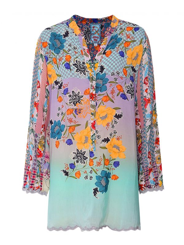 Get a beautiful boho look this season with the Johnny Was Janice tunic. Boasting fresh pops of floral and geometric detailing, this elegant blouse is perfect for any occasion, from garden parties to summer strolls. The tunic features a V-neck, button down placket and delicate embroidered trim details.