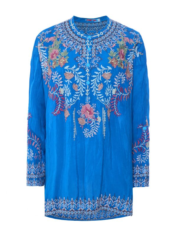 Add a pop of colour to your SS22 collection with the Johnny Was Sundae tunic. Expertly crafted from pure Cupra rayon, the tunic has been cut to a super versatile and effortless relaxed fit. Featuring slits to the sides and a button fastening the tunic is complete with a floral print and an embroidered design, perfect for styling with your go-to pair of jeans.
