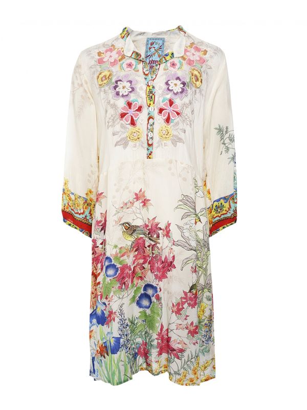 With its flattering silhouette and beautiful floral print, the Johnny Was Wysteria dress is the perfect summer statement piece. Made from rayon, this luxurious mini dress is breezy and laid-back, making it the perfect piece to team with sandals on off-duty days. The dress features a relaxed collar, button placket and elbow length sleeves.