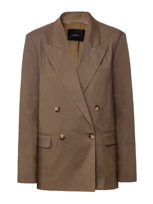 The Joseph Linen Cotton Jaden Jacket is a double-breasted blazer-style jacket. Crafted from a mixture of linen and organic cotton, this soft transeasonal piece is a must-have for a tailored wardrobe. Featuring a classic collar, subtle shoulder padding, buttons to the front and cuffs, a chest pocket and two front flap pockets. With its neutral hue, this jacket is a daily staple for wearing with everything.