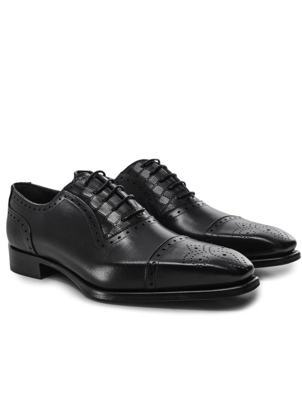 From the exclusive Jules B in-house collection, these Oxford brogues are a refined staple for any formal wardrobe. Handcrafted in Italy using premium calf leather, they showcase a sleek cap toe and traditional Oxford lace-up design, elevated with textured mock croc panels for a contemporary twist.