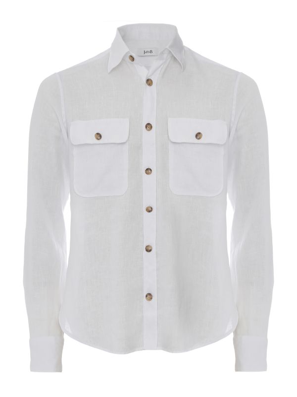 The Jules B Pocket Linen Shirt is a lightweight, breathable button-through shirt crafted from 100% linen. It features a pointed collar, twin chest flap pockets with button closures and marbled buttons down the front for a natural finish. Long sleeves with buttoned cuffs add practical detail. Tailored enough to lift smart-casual outfits yet relaxed for warm-weather layering, it works equally well with Pants or tailored shorts for daytime dressing.