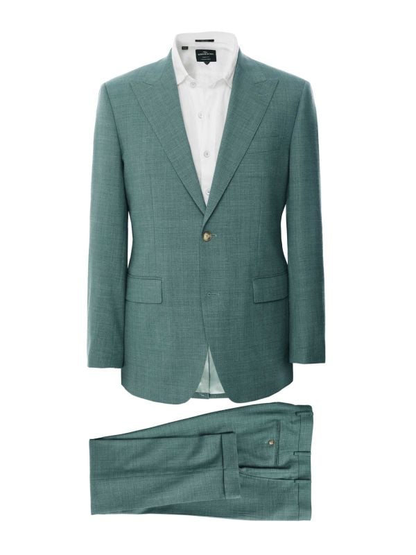 The Jules B wool linen suit is a refined choice for warm-weather tailoring, expertly crafted from a luxurious wool and linen blend that offers both breathability and structure. This two-piece ensemble features a single-breasted jacket with sharp peak lapels and a classic two-button closure, creating a confident, tailored silhouette.