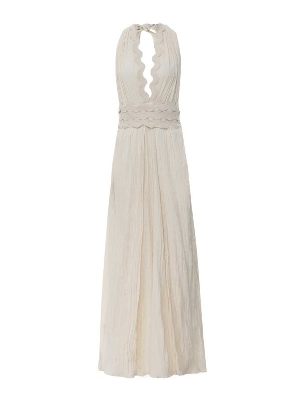 The perfect summer dress? Look to the Long Halter Neck Dress by Kallisto’s Nymphs. This Grecian style dress is crafted from pure cotton with a crinkled look. It showcases a beautiful plunging neckline with a woven, wavy edge and ties around the back of the neck. It has an open back with ties and the same woven details at the waist. Wear this Kallisto’s Nymphs maxi dress throughout the summer season, dressing it both up and down for any occasion.