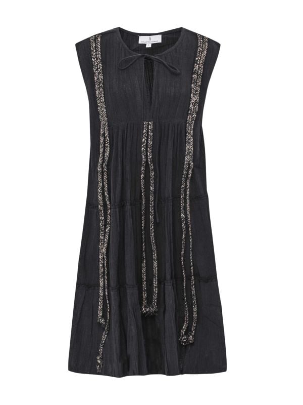 Looking for the mini dress of dreams? The Rope Mini Dress by Kallisto’s Nymphs is a summer staple for any wardrobe, whether worn for casual weekend plans or dressed up with heels on holiday. Crafted from 100% cotton, this textured Kallisto’s Nymphs mini dress features an open neckline with ties, a tiered skirt with frill trims and woven rope details with a touch of sparkle.