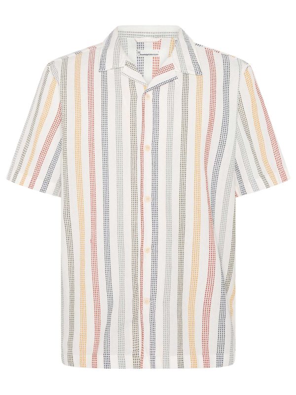 The Knowledge Cotton Striped Cotton Shirt is a relaxed short-sleeved design ideal for warm-weather dressing. Crafted from cotton, it features a camp collar and button-through front that create a contemporary, easygoing silhouette. Vertical dotted stripes introduce subtle texture while the straight hem allows the shirt to be worn tucked or untucked. Lightweight and breathable, the pattern complements a variety of separates for easy coordination. An understated option for everyday rotation, it pairs well with shorts or chinos for weekend plans and holiday wear.