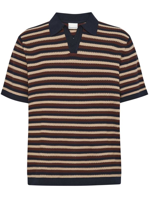 Refresh your warm-weather rotation with the Striped Knitted Polo from Knowledge Cotton. This short-sleeve knitted polo features a horizontal striped pattern, an open v-placket and a traditional polo collar for a smart-casual silhouette that layers easily or stands alone. Ribbed cuffs and hem provide subtle structure while the textured knit adds depth. Tailored proportions and retro-inspired detailing make it a versatile option for weekend or city wear. Pair with linen Pants or tailored shorts for a considered, day-to-night look. Designed for everyday wear.