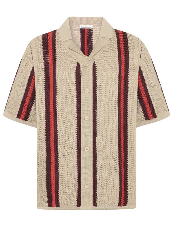 The Knowledge Cotton Striped Knitted Shirt is a lightweight, open-knit piece designed for warm-weather layering. This short-sleeve style features a camp collar and a button-front fastening, with vertical striped panels that add visual rhythm. The relaxed fit sits comfortably over tees or pairs with coordinated shorts for a cohesive look. Finished with neat ribbed trims at the cuffs and hem, the textured knit balances structure with breathability. Wear it casually with lightweight Pants or sandals for an easy, seasonal edit that highlights movement and tactile interest.