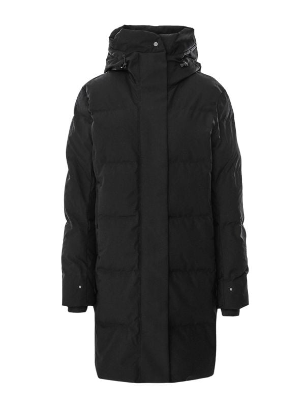 The Cassini Quilted Coat is a padded, mid-length outer layer from KRAKATAU. It features a generous hood with adjustable toggles, a zip fastening concealed by a press-stud placket and horizontal quilting for added warmth. Practical details include front pockets with press-stud closures and ribbed inner cuffs to seal out the cold. The clean silhouette sits above the knee for easy movement and layering. Ideal for colder months, it layers easily over knitwear.