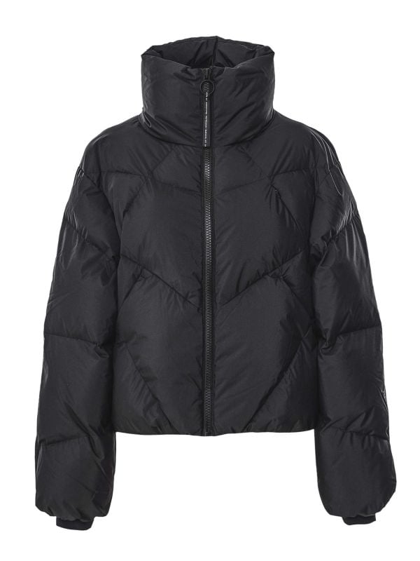 The Nebula Puffer Jacket is a cropped, padded coat from KRAKATAU. It features a high funnel collar, full-length zip with a circular ring pull and chevron quilting across the body for structured volume. The boxy silhouette sits at the hip with an elasticated hem to seal in warmth. Side slip pockets and a padded interior make it practical for colder days. The jacket's oversized sleeves and short length create a modern, layered look while keeping movement unrestricted.
