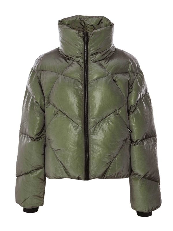 The Nebula Short Puffer Jacket from KRAKATAU is a cropped padded jacket. Pronounced chevron quilting shapes the body while a tall funnel collar provides extra coverage. A central zip with ring pull fastens the front and zipped side pockets keep essentials secure. The hem is elasticated to create a blouson silhouette and internal cuffs seal the sleeves. Lightweight yet insulated, the piece layers easily over knits and trousers for city wear, offering a compact, contemporary outer layer. Practical details make it easy to wear on colder days.