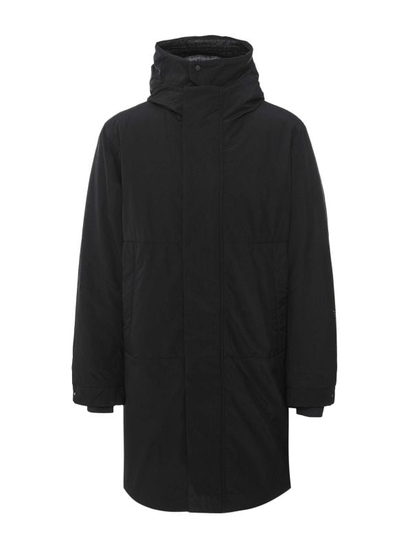 The KRAKATAU Schorl Hooded Parka is a longline outer layer designed for cold-weather use. It features a high protective collar, a hood and a concealed front zip with a snap placket for added protection. Generous hand pockets and a curved hem lend practical function to a pared-back silhouette. Internal stretch cuffs and snap-adjustable outer cuffs help seal out the cold, while a quilted padded lining provides extra warmth. Subtle sleeve branding and a streamlined profile make it suitable for city and weekend wear.