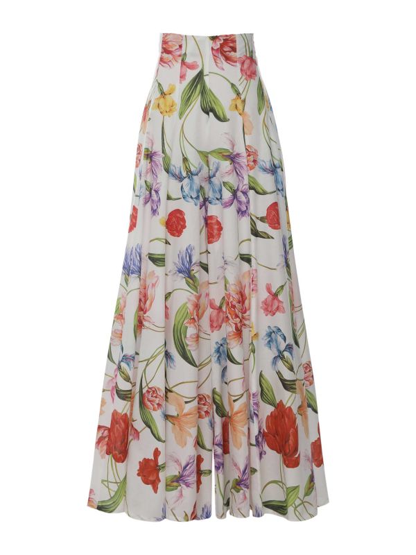 The Debby Wide Leg Pants from Lavi present a full, skirt-like silhouette on a floor-skimming, wide leg. A fitted high waistband and panelled construction form soft pleats that fall into generous volume, offering abundant movement. The all-over floral print provides a decorative finish while the tailored waist preserves structure. Pair with a tucked shirt or a structured top to balance the sweeping profile; breathable cotton keeps the shape comfortable for warmer days.