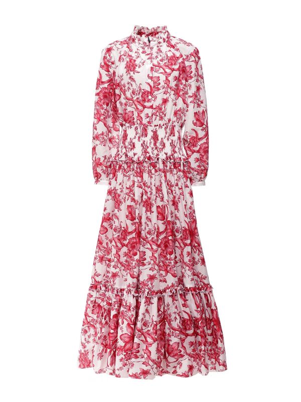 Add a touch of romance to your wardrobe with the Lavi Era dress. Crafted in Italy from 100% cotton, this lightweight maxi dress is a must for every summer occasion. It features a stand collar with frill details, a flattering smocked waist, long sleeves with button cuffs, an elegant tiered skirt and a beautiful floral print throughout.