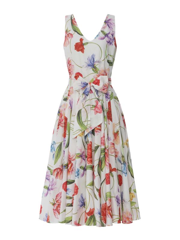 Lavi's Ginger Midi Dress is a sculptural day-to-evening dress with a defined waist and voluminous pleated skirt. The sleeveless V-neck design frames the upper body, while a self-tie belt creates a flattering silhouette. Gently pleated panels add movement and a graceful profile through the skirt, making it well suited to events and summer gatherings. Made from cotton with considered tailoring, the dress balances structure and ease for lasting wear. Pair with sandals for daytime or heels for evening; layer with a lightweight jacket when required.